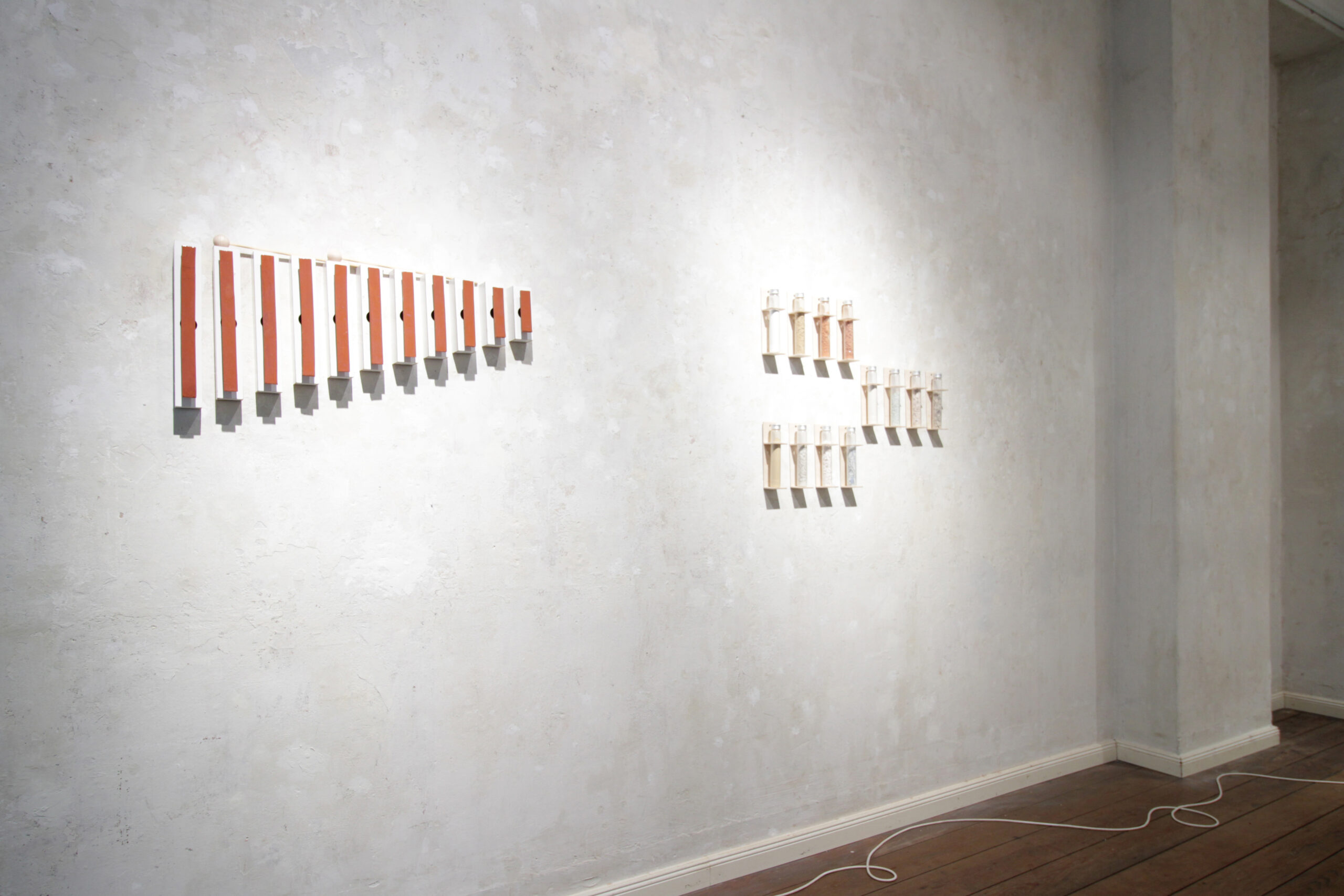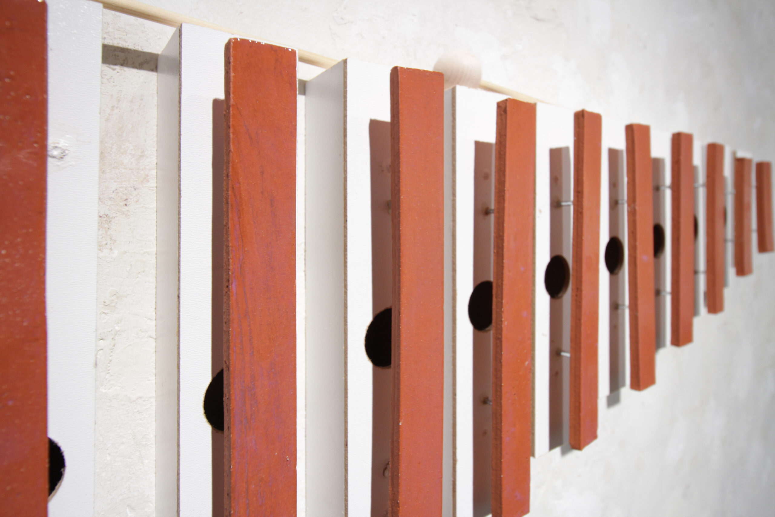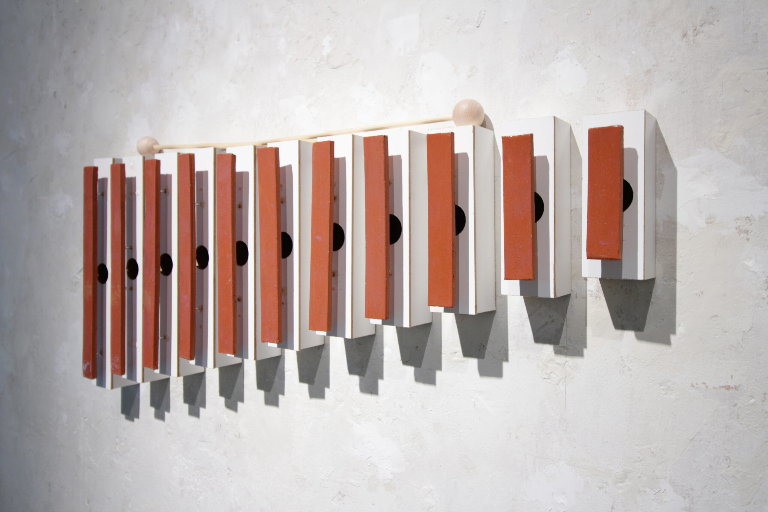 Einem Metallophon ähnelnd werden in dieser Arbeit Tonblöcke präsentiert, die mit einem Holzschlägel gespielt werden können. Mit der Erwartung hier einen perfekt resonierenden Klang zu hören, werden wir entäuscht. Wir hören den Klang von gebranntem Ton.