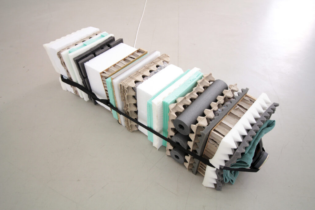 Der „Kleine Gedanke zum Material“ ist ein Arrangement von geschichteten Dämmstoffen, die zusammen mit zwei Lautsprechern zu einer säulenartigen Form zusammengezurrt wurden. Die Klänge der aneinanderreibenden Materialien wurden aufgenommen und durch die Lautsprecher wieder in den dämmenden Körper zurückgespielt. Dabei erklingt die Arbeit in einer Art „Selbstgespräch“.