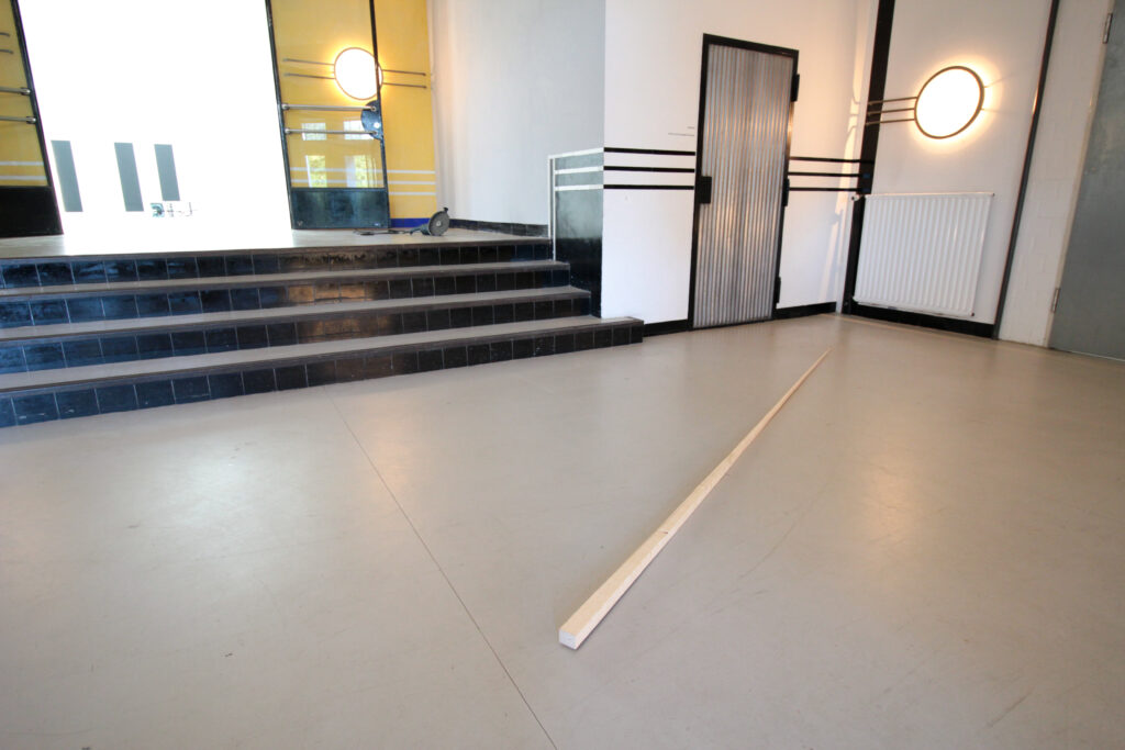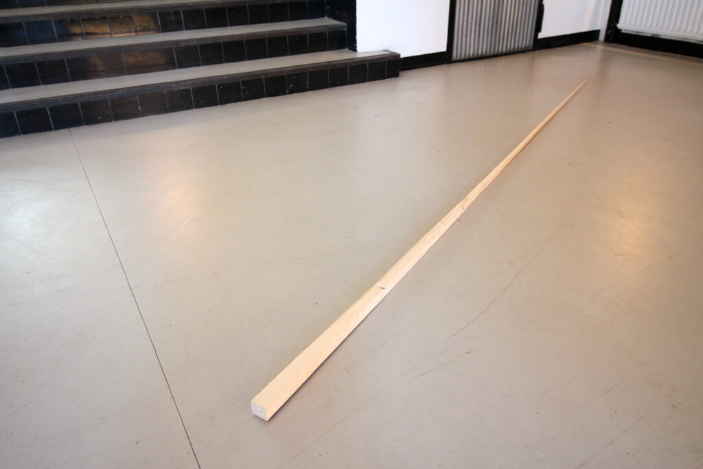 Quer über dem Boden im Ausstellungsraum liegt eine zur Nadel geschnittene Dachlatte. Sie wirkt fast so, als hätte sie eine praktische Funktion. Als sei derjenige, welche sie gebraucht hat, kurz abwesend.