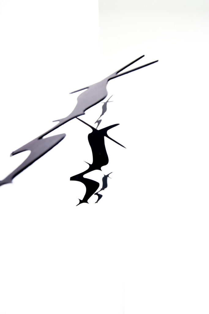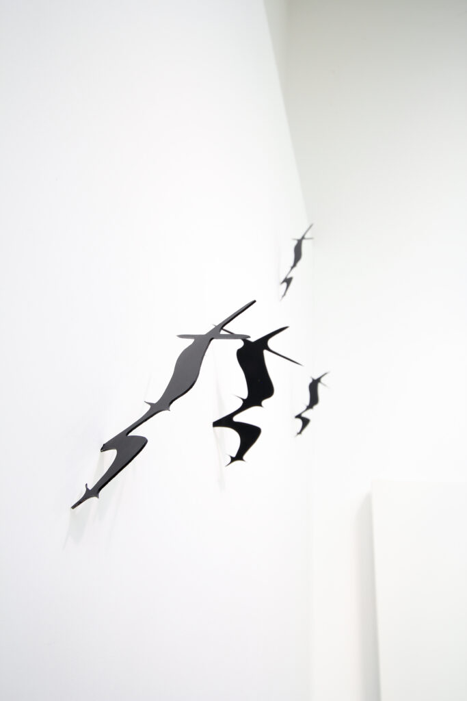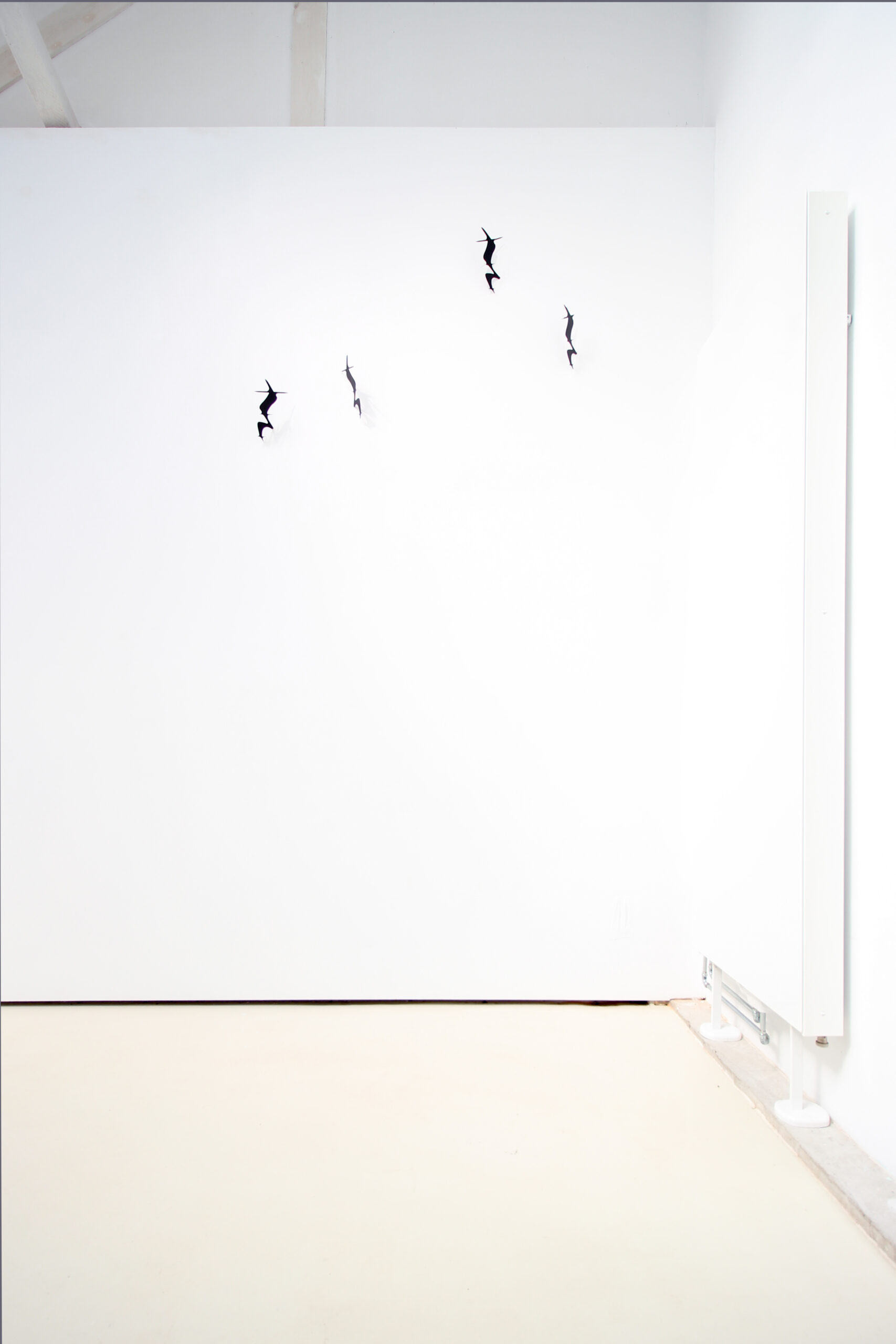 Die metallenen Formen wurden wie Wurfsterne in eine Wand geworfen und stecken dort fest. Ihre scharfen Kanten und die dynamische Anordnung erinnern an eine eingefrorene Bewegung. Aus der stillen Notation wird eine physische Geste: Die Pause, eigentlich ein Zeichen der Abwesenheit von Klang, erscheint hier mit Kraft und Energie in den Raum eingeschrieben. So verwandelt sich ein unscheinbares musikalisches Symbol der Stille in ein sichtbares, fast aggressives Zeichen – eine materialisierte Pause.