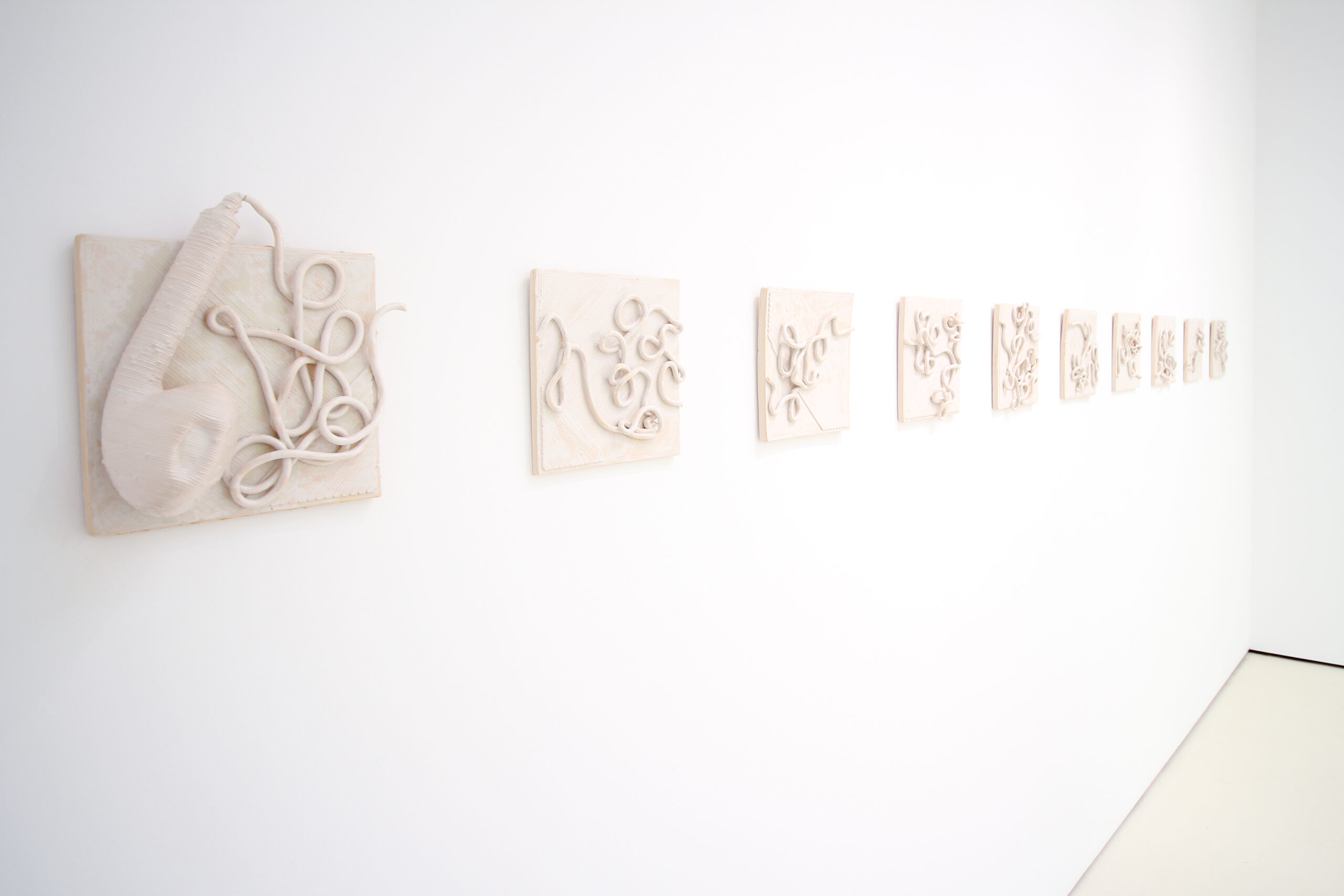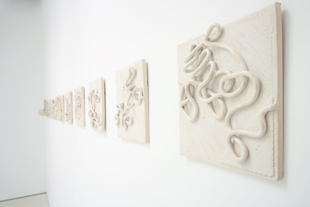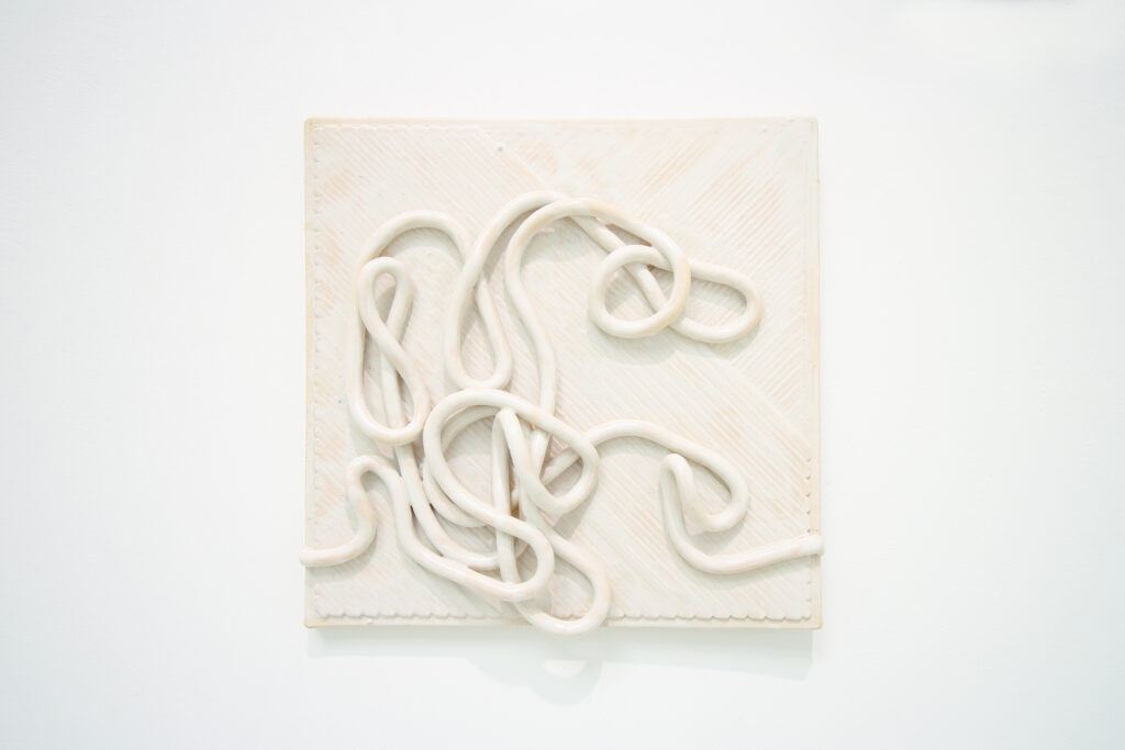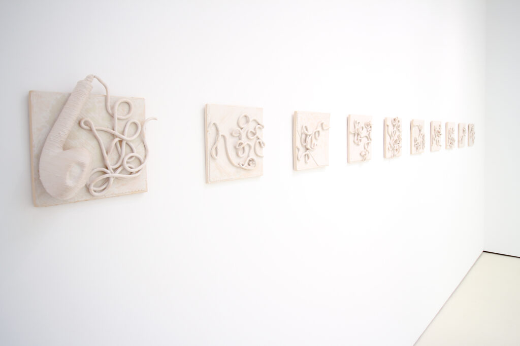 Ein In-Ear-Kopfhörer erscheint in dieser Arbeit stark vergrößert als keramisches Relief an der Wand. Mit einem 3D-Drucker aus Ton gefertigt und anschließend gebrannt, wird das sonst kleine technische Objekt zu einer ruhigen, skulpturalen Form. Auf weiteren Reliefplatten setzt sich das Kabel fort, das vom Kopfhörer ausgeht und sich über die Wandfläche hinweg ausbreitet.